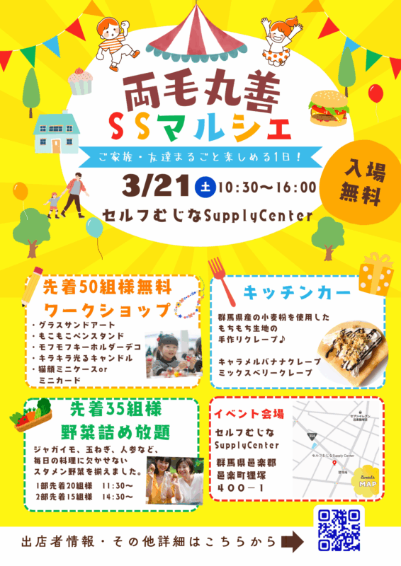 2026/ 03 両毛丸善SSマルシェ このイベントについて ▼ 出展者の皆様へ 両毛丸善SSマルシェ 出店要項 開催期間 2026年03月21日(土) 時間 10:30〜16:00 出店申し込み受け付け状況 募集終了 場所 セルフむじなSupply CenterSS(両毛丸善) 出店者一覧