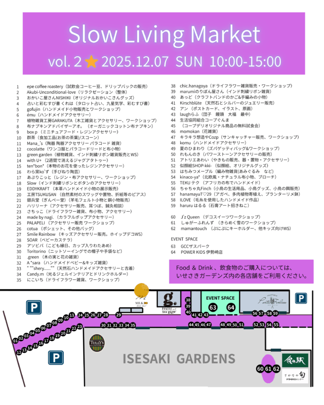 2025/ 12 ISESAKI Slow Living Market vol.2 このイベントについて ▽ vol.1 開催の様子 ▽ 出展者用出店マニュアル 1207_Slow Living Market 開催期間 2025年12月07日(日) 時間 10:00~15:00 出店申し込み受け付け状況 募集終了 場所 伊勢崎ガーデンズ 出店者一覧