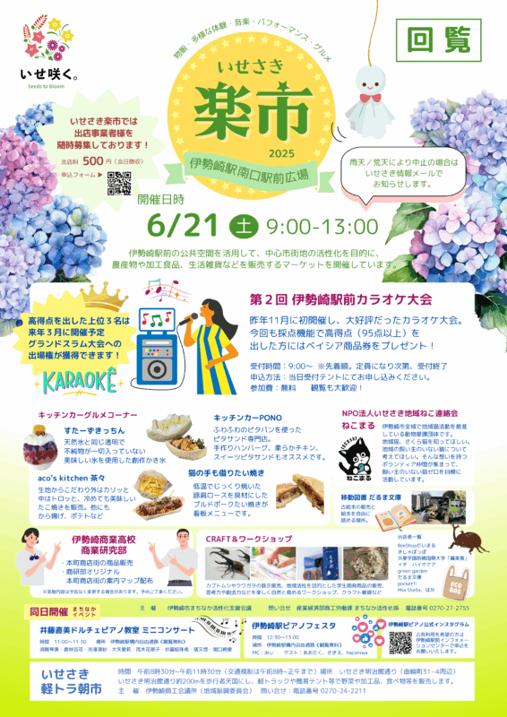 伊勢崎駅前の公共空間を活用し、毎月第三土曜日に、生活雑貨や食品等を販売する「いせさき楽市」を開催しています。
