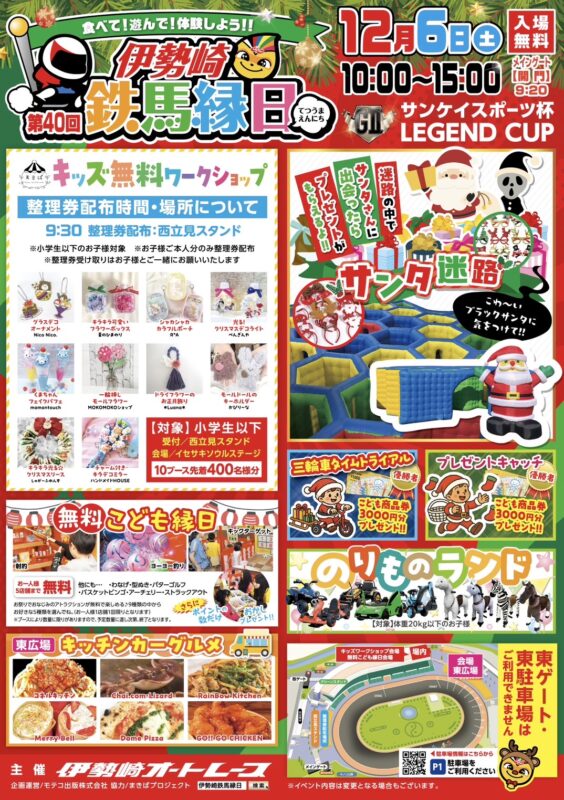 伊勢崎オートレース主催「伊勢崎鉄馬縁日」(てつうまえんにち)は、お子様に楽しんでいただける無料縁日コーナー、無料ワークショップをはじめ、毎回 楽しめるコンテンツがいっぱいのファミリー向けイベントです。